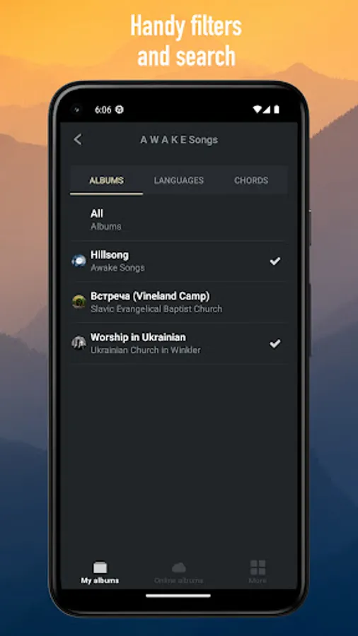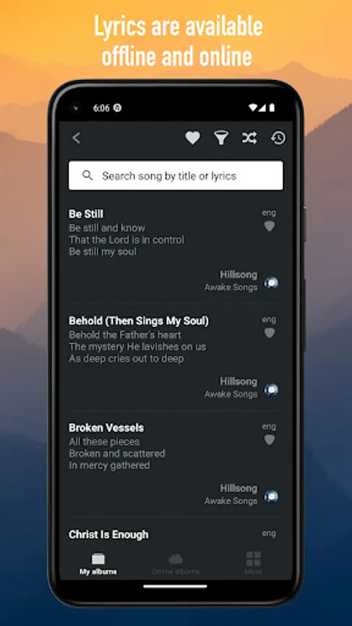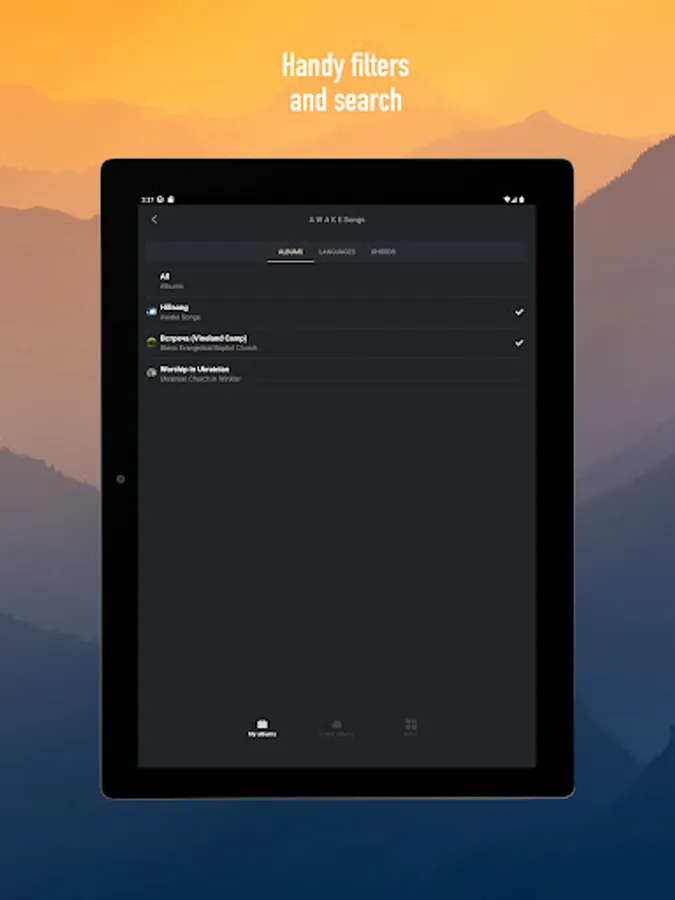 You can browse songs and albums online, or download an album to use it without internet access. You can use Awake Songs anywhere: at church, at home, in the camp, at the training, on the trip.