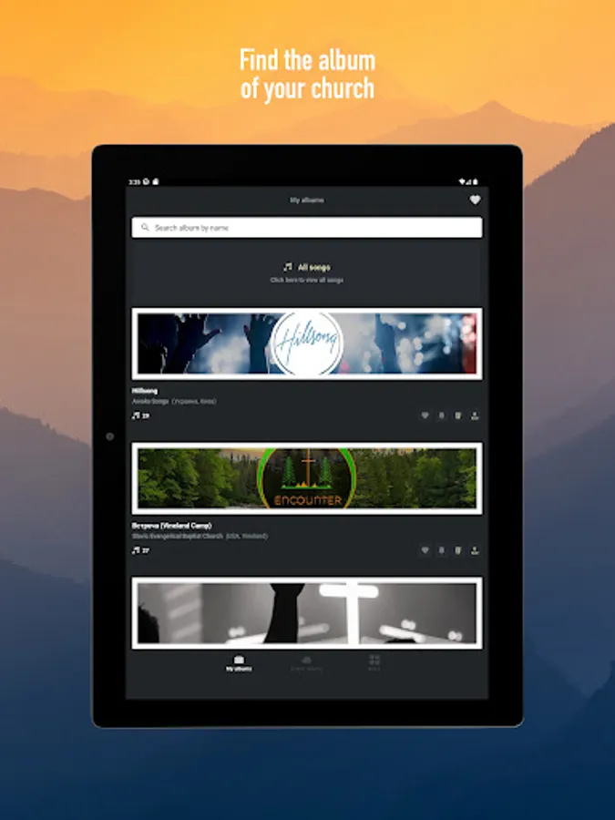 - Album search by album name or church name, organization, worship group