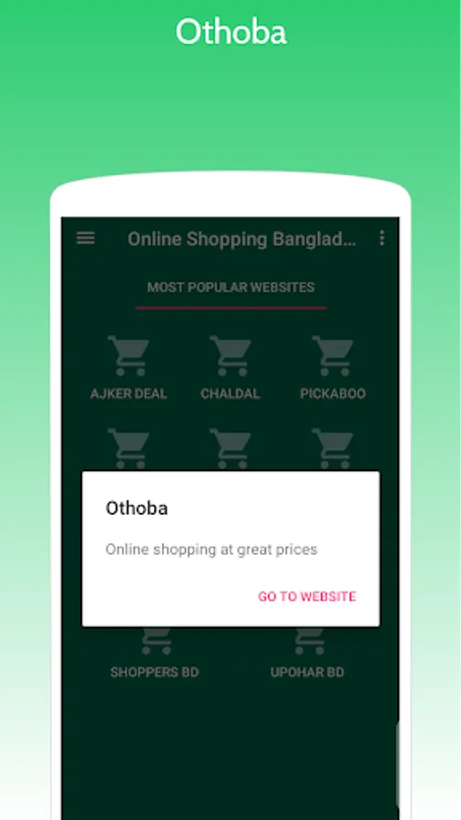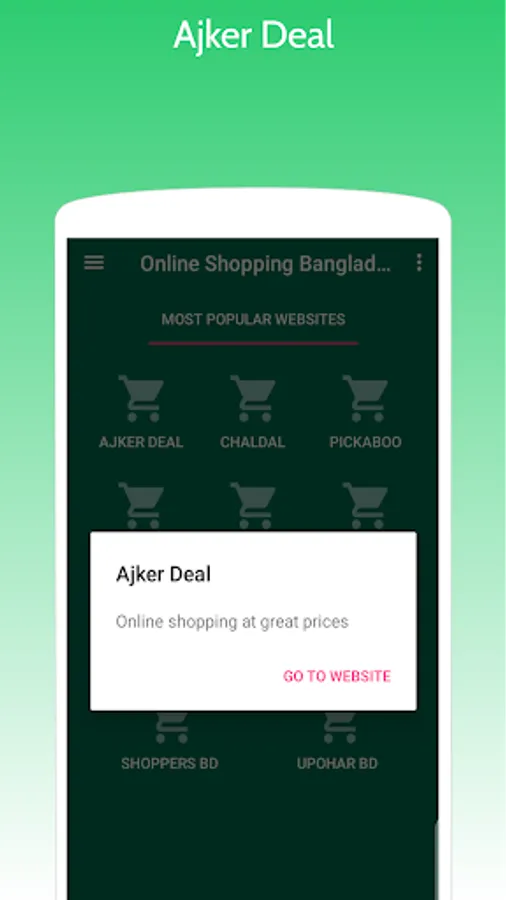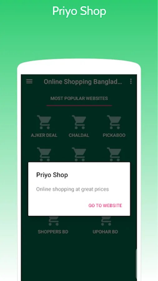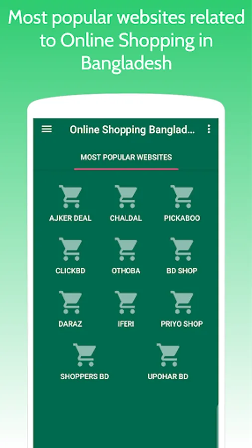 Online Shopping - Bangladesh application offers access to top online Best Shopping Sites in Bangladesh like Ajker Deal, Chaldal, Pickaboo, ClickBD, Othoba, BD Shop, Daraz, Iferi, Priyo Shop, Shoppers BD and Upohar BD. It is simple to get all of your favourite shopping websites.