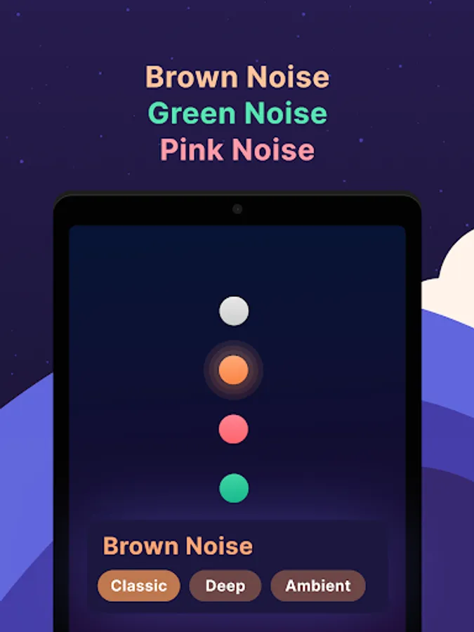 • Brown Noise (or Red Noise) has a rich, deeper character like a roaring ocean. We recommend brown noise for sleep, and it's also great for focus and meditation.