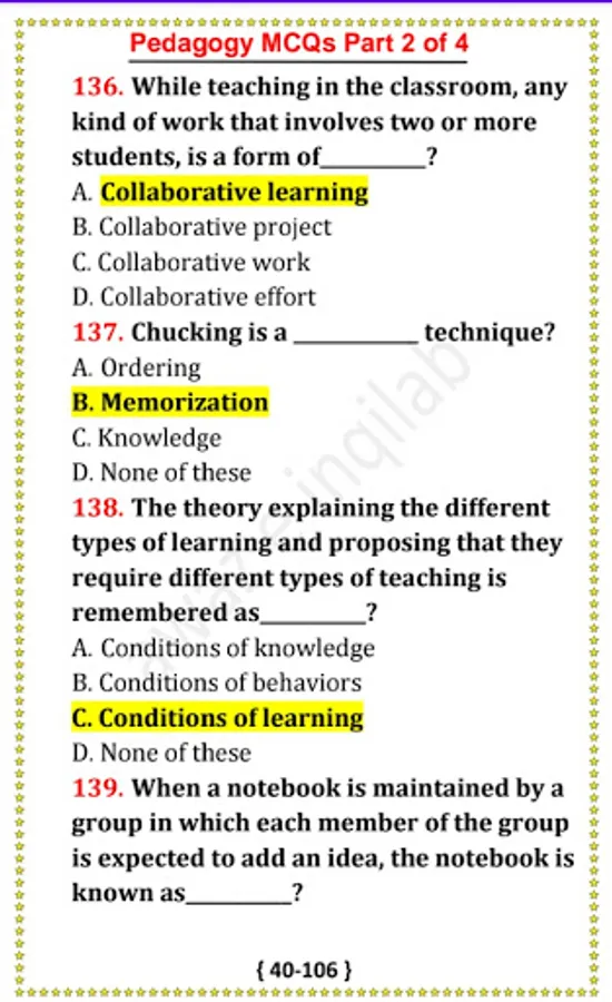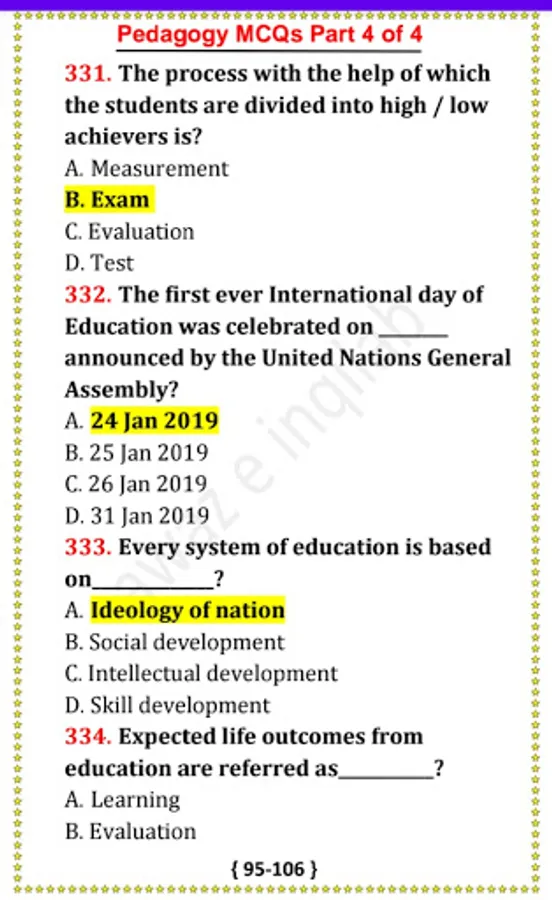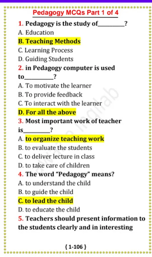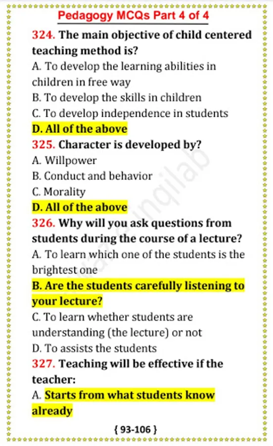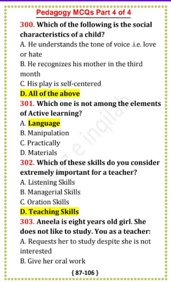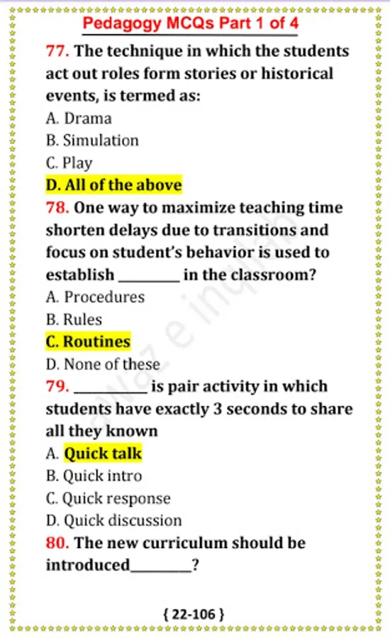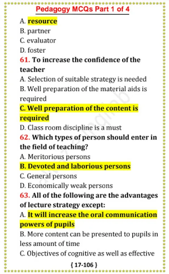Pedagogy MCQs for Preparation. Here you will Find the Complete MCQs of Pedagogy/Education for NTS, FTS, KPPSC, FPSC, PPSC, SPSC, CSS, PMS and Educators Test Preparation. These MCQs are also useful for primary school teacher (PST), subject specialist SST, physical education teacher, Drawing master and Arabic teacher tests.