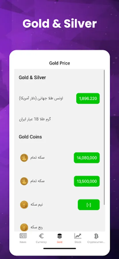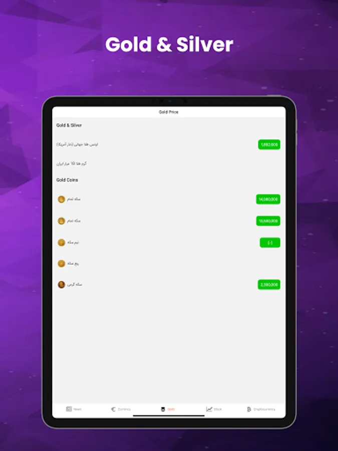 The latest Oil, Gold and other commodities prices are other information you will be updated everyday by using Mesghal App. These rates include: