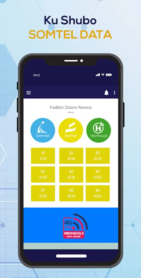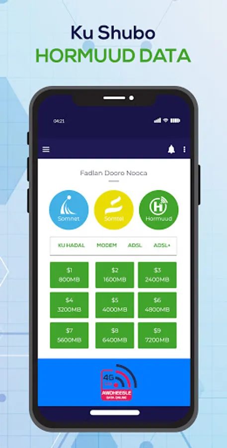 Awdhiigle Data waa App kuu fududeynaa inaad si fudud ugu shubato xirmooyinka internet ka ee Somnet , Somtel iyo Hormuud bixiyaan , adoon wicin qof oo ii soo tuurna oran ayaad si sahlan ku heleysaa xirmo internet ah.