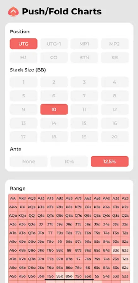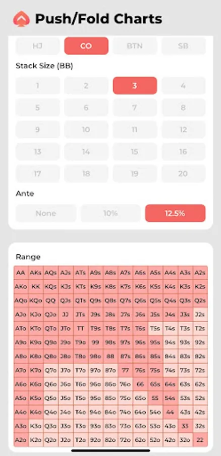 Push/Fold is a common strategy used in tournaments in which you either go all-in preflop or fold. This app will help you understand when you need to fold or shove your entire stack when you are short-stacked in poker tournaments. Use these charts as a study tool to help you improve your understanding of push fold scenarios.