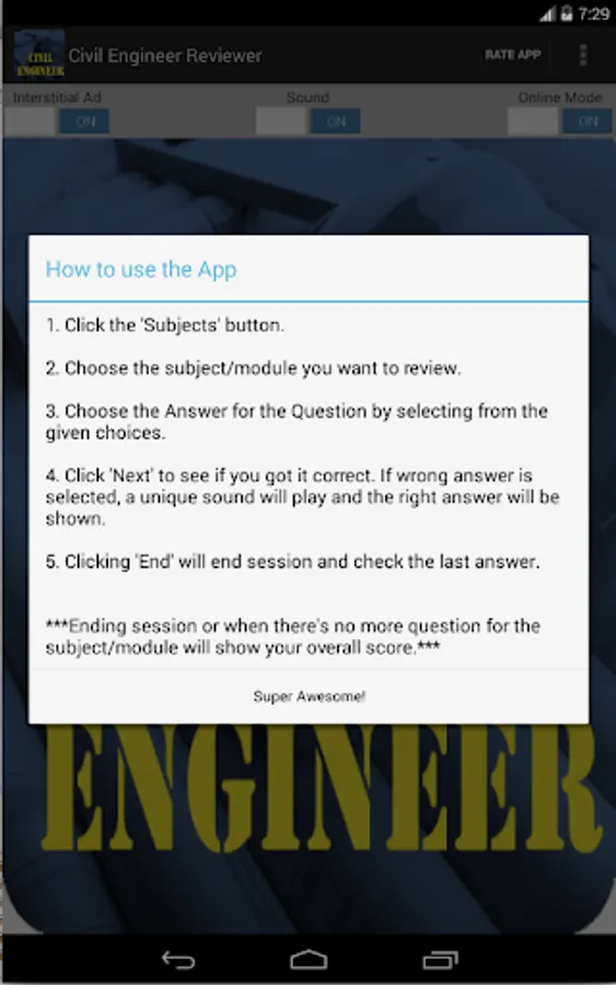 Civil Engineer Reviewer app is a multiple choice type exam reviewer. Questions are subdivided to different subjects pertaining to Civil Engineering students and professionals. Away from home or school and need to study for board exam? not a problem. Civil Engineer Reviewer app is perfect for portability. Compose of more than 350 questions and more to come on the coming updates