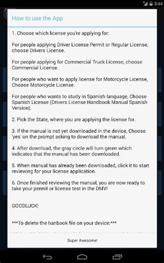 Perfect for people for first time getting license for permit or student, commercial license and motorcycle license. Everything included in one app with practice test included!