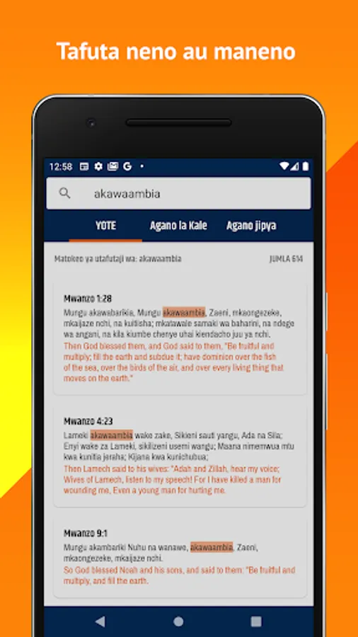 Swahili-English Bible (Biblia Takatifu) it enables you to read a word of God easily anywhere.