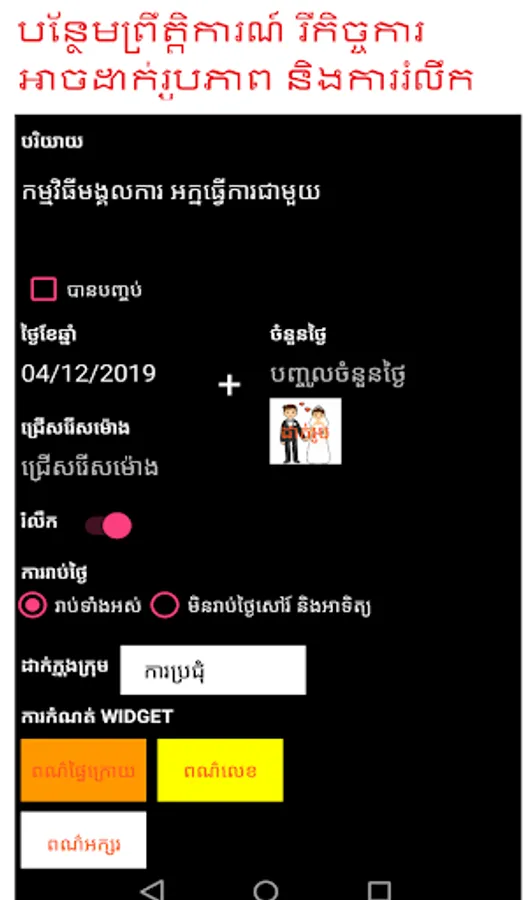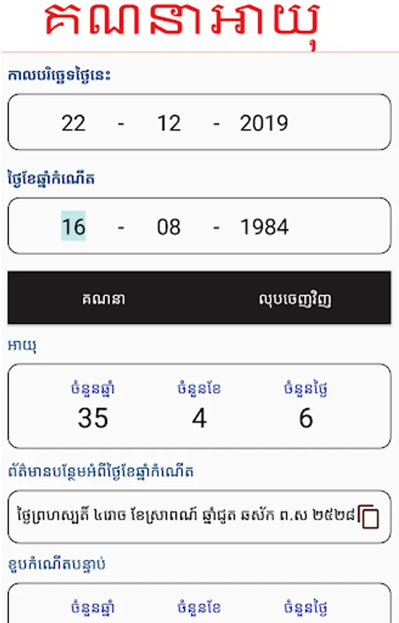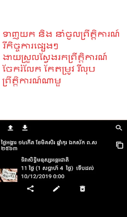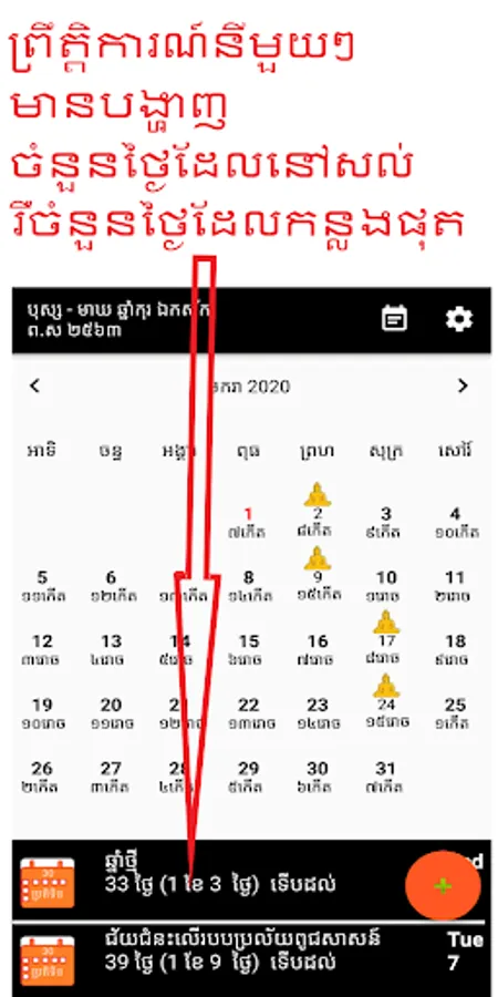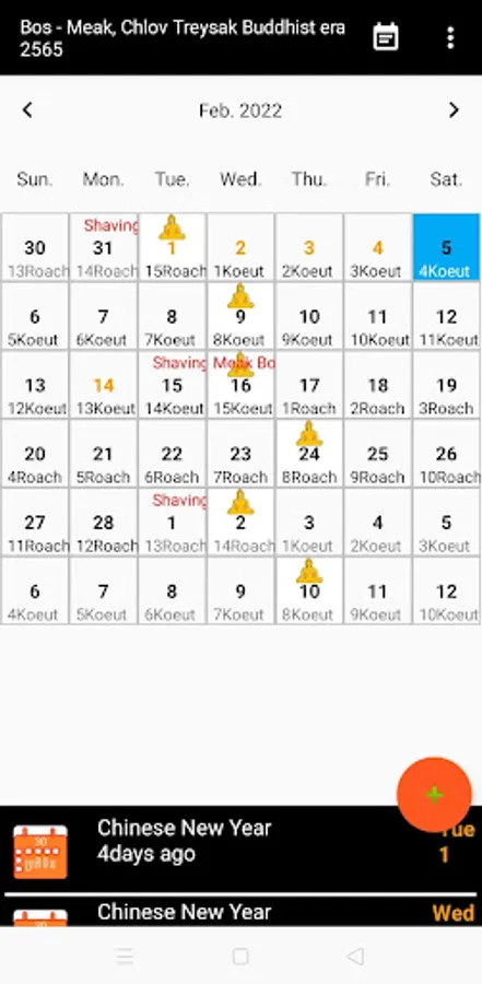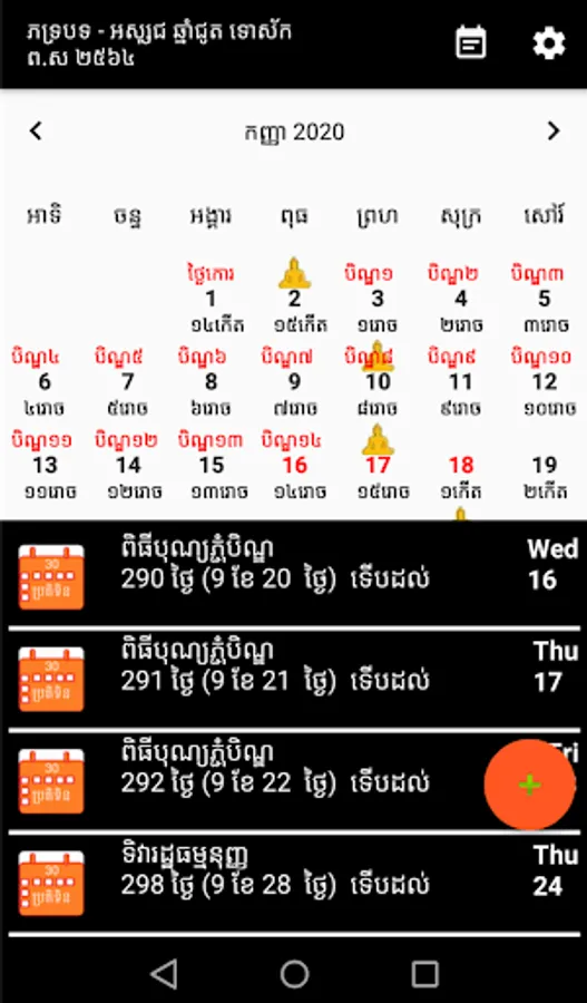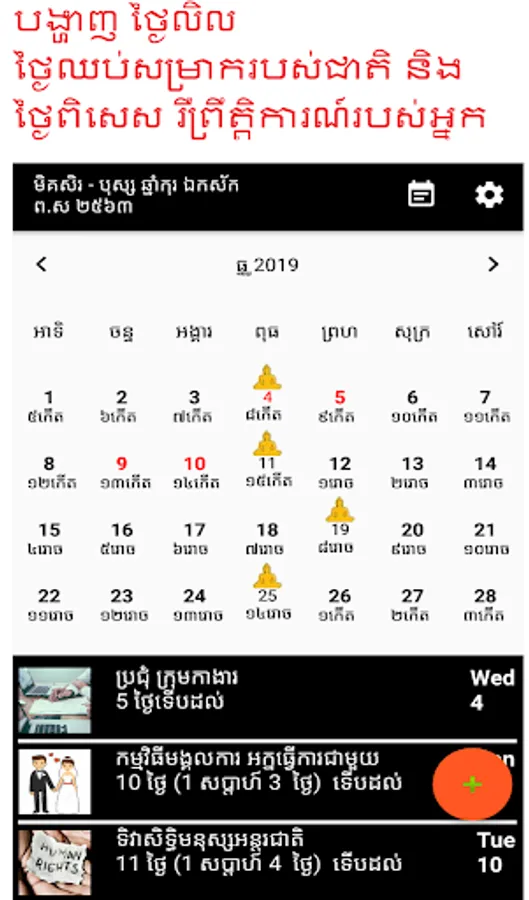 Khmer Calendar is easy to view public holidays in Cambodia and your special events or tasks. It also shows religious events such as Meak Bochea, Pisak Bochea, Jole Preah Vosa, Jegn Preah Vosa, Kann Ben 1st -14th, Kathin, Sompeas Preah Khae, and Thgnei Sel.