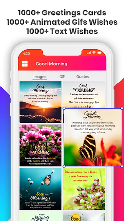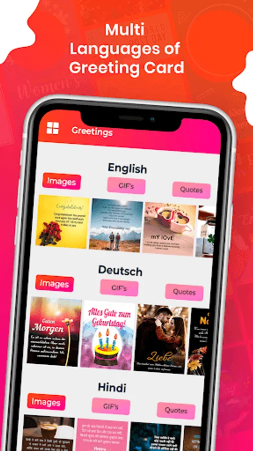 Greetings All in one app have lots of category and each category has the most beautiful collections of 500+ greetings with quotes, 500+ Lovely Animated Gifs, and 500+ Adorable Text Messages.