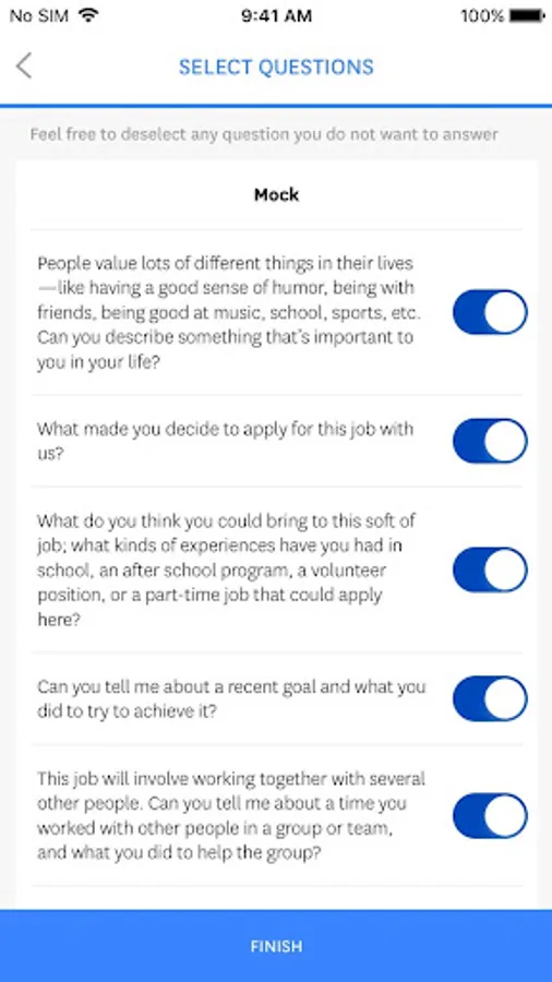 • Information Interview: The app provides a curated list of questions about jobs that help structure the conversation. Users can select any subset and add their own.