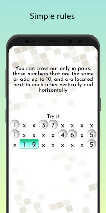 The game that everyone knows from childhood, which is known under different names - "Seeds", "Numberzilla", "Numbers" "Numberama", "Take Ten", Collect ten", "Fortune-telling ", "Columns", "1-19". Different names, but the principle is the same, you can cross out all the numbers on the field, with very simple rules, you can cross out only in pairs and only those numbers that are the same or add up to 10, and are located to each other or through the already crossed out numbers vertically and horizontals. Previously, it only required a sheet of paper and a pencil, but now this game is available for Android.