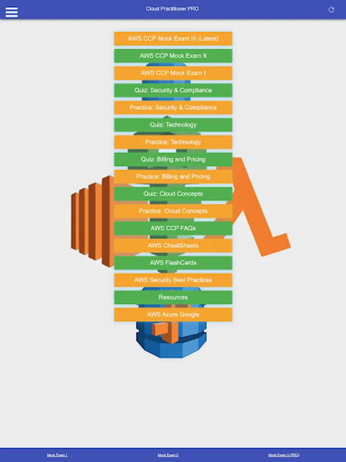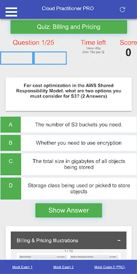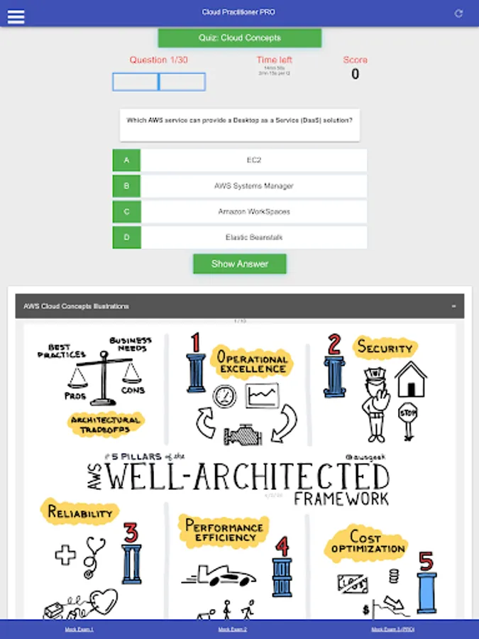 Quizzes and mock exams cover: VPC, S3, DynamoDB, EC2, ECS, Lambda, API Gateway, CloudWatch, CloudTrail, Code Pipeline, Code Deploy, TCO Calculator, SES, EBS, ELB, AWS Autoscaling , RDS, Aurora, Route 53, Amazon CodeGuru, Amazon Bracket, AWS Billing and Pricing, Simply Monthly Calculator, cost calculator, Ec2 pricing on-demand, AWS Pricing, Pay As You Go, No Upfront Cost, Cost Explorer, AWS Organizations, Consolidated billing, Instance Scheduler, on-demand instances, Reserved instances, Spot Instances, CloudFront, Workspace, S3 storage classes, Regions, Availability Zones, Placement Groups, Amazon lightsail, Amazon Redshift, EC2 G4ad instances, EMR, DAAS, PAAS, IAAS, SAAS, Machine Learning, Key Pairs, AWS CloudFormation, Amazon Macie, Textract, Glacier Deep Archive, 99.999999999% durability, Codestar, AWS X-Ray, AWS CUR, AWS Pricing Calculator, Instance metadata, userdata, SNS, Desktop As A Service, EC2 for Mac, Aurora Postgres SQL, Kubernetes, Containers, Cluster, IAM, S3 FAQs, EC2 FAQs, IAM FAQs, RDS FAQs, AWS Private 5G, Graviton, AWS Mainframe modernization, Lake Formation, On-demand analytics, EMAR, MSK, etc.