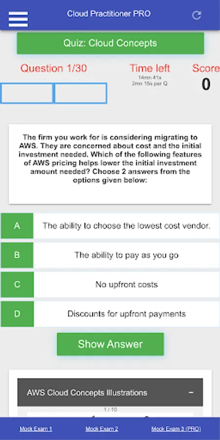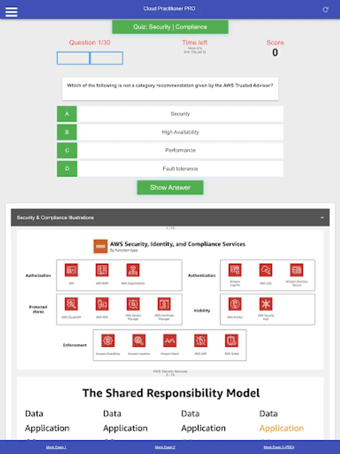 This AWS Cloud Practitioner CCP CLF-C01 Exam Preparation App is the ultimate AWS CCP exam prep tool. It comes with AWS CCP practice exams, testimonials from People who have passed the AWS CCP CLF-C01 exam, AWS flashcards, AWS cheat sheets, AWS quizzes with score tracking and progress bar, AWS countdown timer and highest score savings. Users can only see answers and score card after completing the quiz. AWS FAQs for popular AWS services are also included. This app is a must-have for anyone serious about passing the AWS CCP CLF-C01 exam.