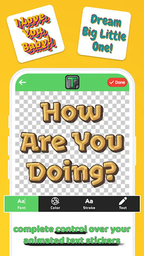 Animated Text Sticker Maker is designed to give you complete control over your animated text stickers, allowing you to customize them to your liking, change the font, the color and add stroke to your text to make it stand out. Plus, with the ability to save and share your creations, you can show off your unique animated stickers to your friends and family.