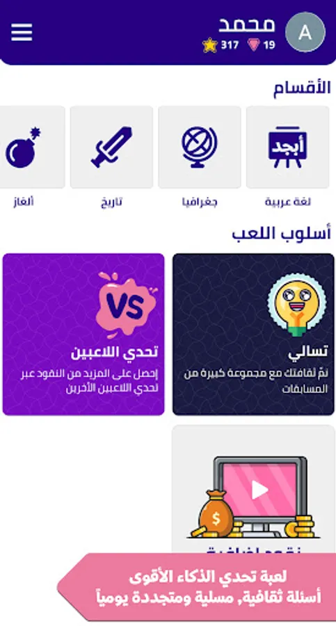 The questions in the competitions vary: cultural questions, scientific questions, questions that require intuitive speed, some of them require knowledge in a specific field, and some of them include various images and slogans, and there are also Islamic competitions, intelligence games, word games, arithmetic games and puzzles.