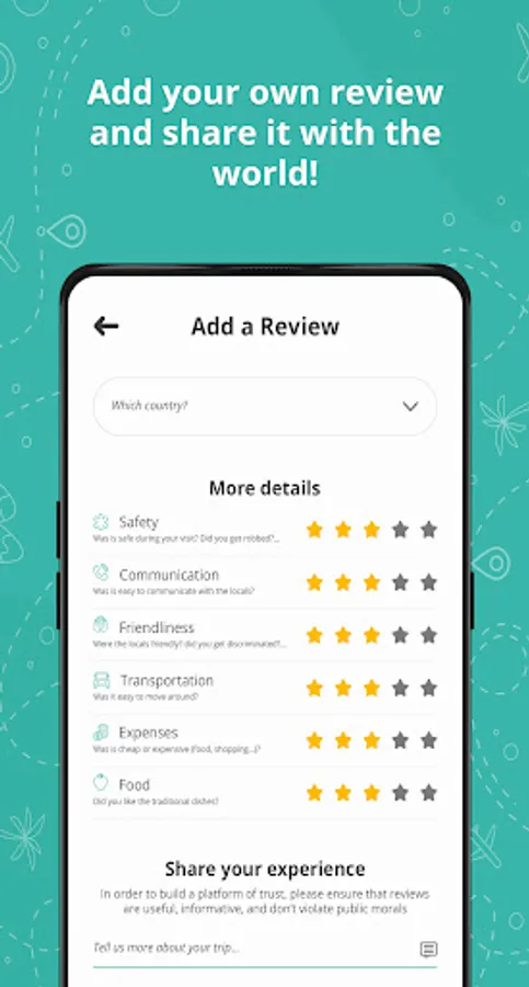 Submit your own reviews of countries you have visited and share your experience so others can benefit from it before traveling.