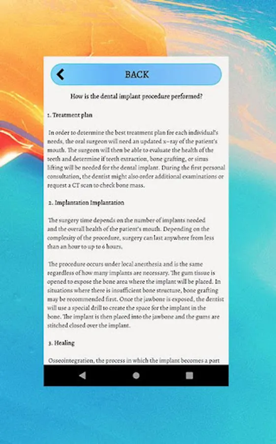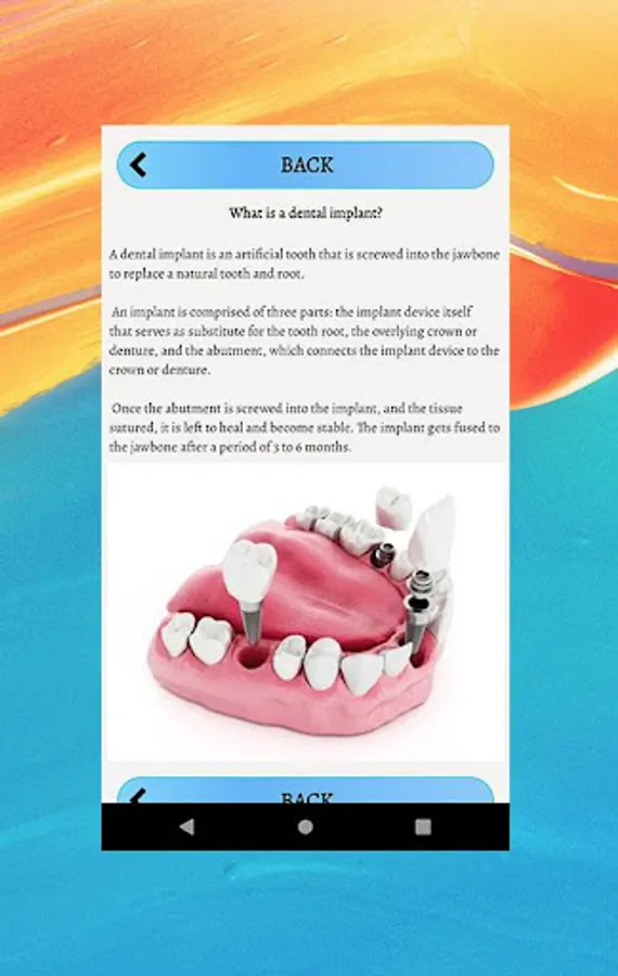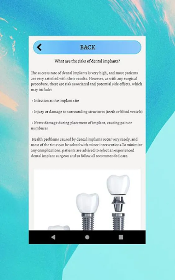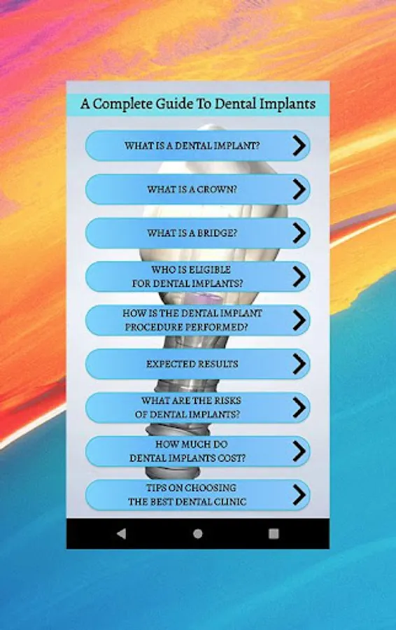 In our Dental Implants Guide app, we provide answers to the most common questions asked by those considering dental implant surgery. We offer an overview of how the procedure actually works, what kind of results to expect, and how you can ensure your implant treatment is successful.