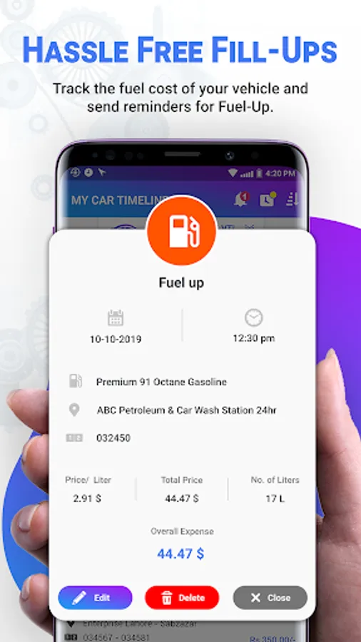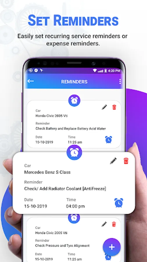 Vehicle maintenance helps in auto maintenance is proper car management process to track and remind car expenses, car fuel log, fuel consumption, cheap gas log, fuel logger and car service. Car maintenance app is expense tracker app helps to save money with cheap gas log, auto gas mileage, fuel economy, fuel logger, and car maintenance maintains car expenses with expense manager. Auto care has defined algorithm for calculating car fuel log for cheap gas log & auto gas mileage to save money. Auto Mate App really cares for car service, vehicle expenses and reminds after a fixed interval for next auto maintenance and vehicle maintenance.