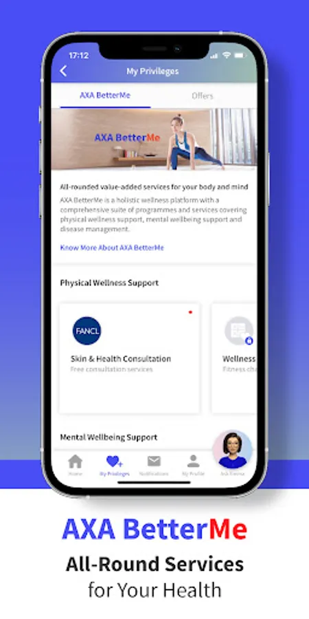 Explore AXA BetterMe health services (including physical wellness support, mental wellbeing support and chronic disease management) under “My Privileges”:
