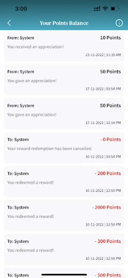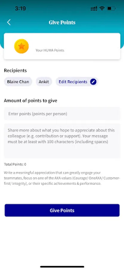 4. Point system: Give or collect HUMA points from various activities e.g. profile set-up, giving and receiving appreciation.