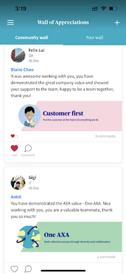 2. Appreciation Wall: Send and receive appreciation messages to recognize achievements and excellent performance of different users.