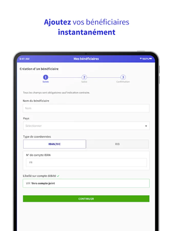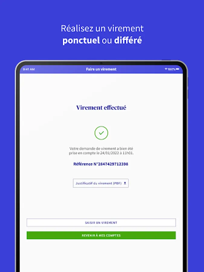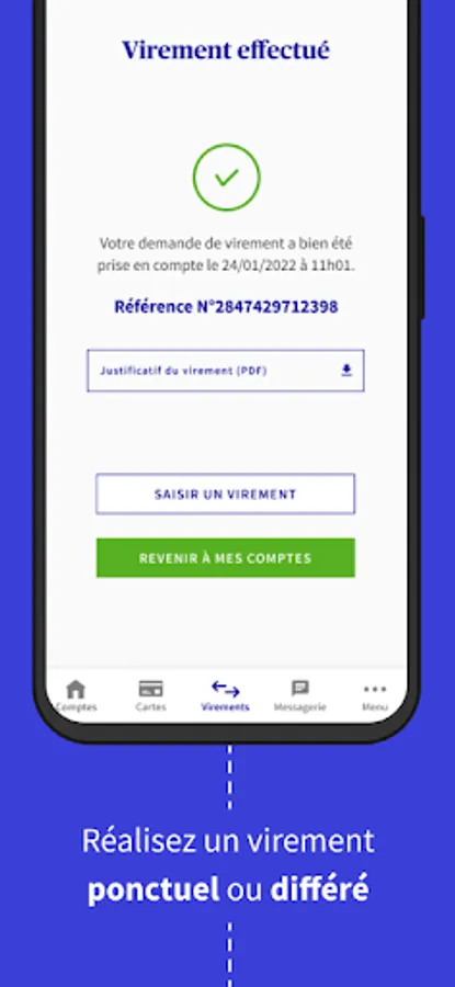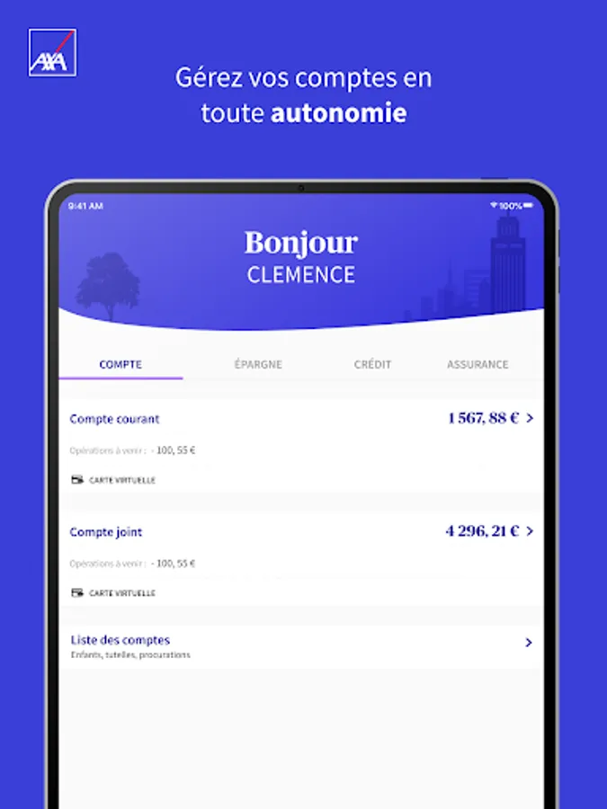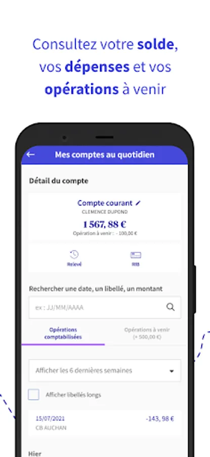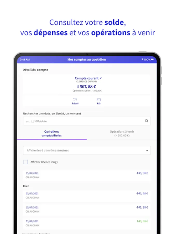 • Consult at a glance the balance of your accounts and passbooks, your outstanding cards, the monitoring of your consumer and real estate loans, etc.