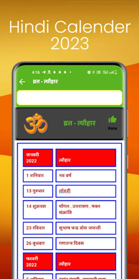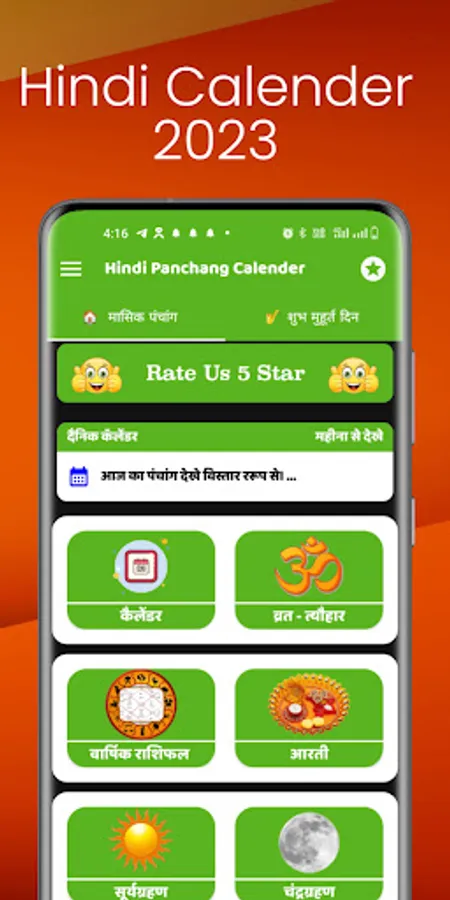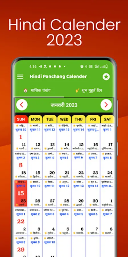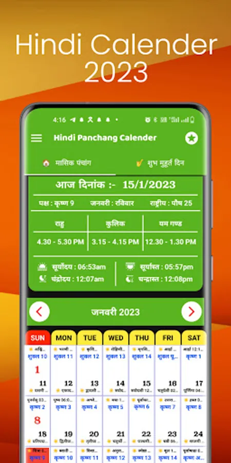 Hindi Calendar with 2023 Panchang offline app has the complete information like Holidays, Festival list, Subha Muhurat, fasting days.