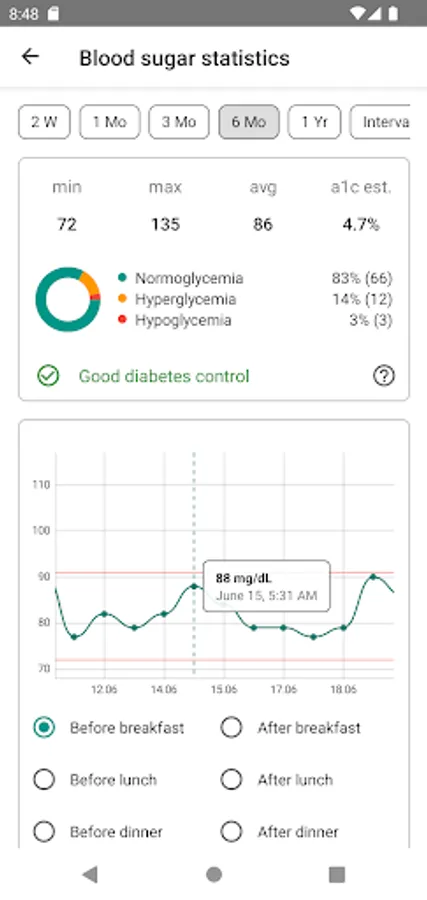 • Coloured charts - " a glucose graph" for visual monitoring of the results in different periods, e.g. 2 weeks, one month, three months. Users can also see the graph of HbA1c changes in a year.