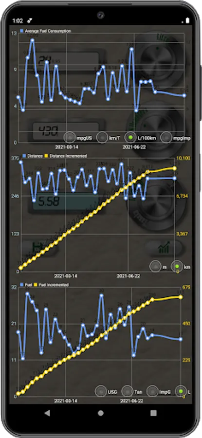 • Drawing summary charts for distance, fuel, and fuel consumption data,