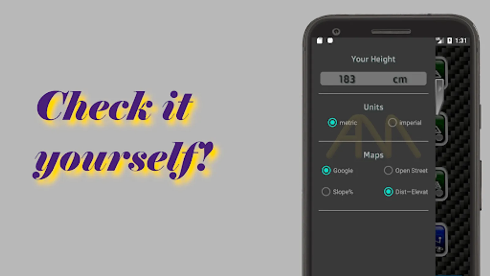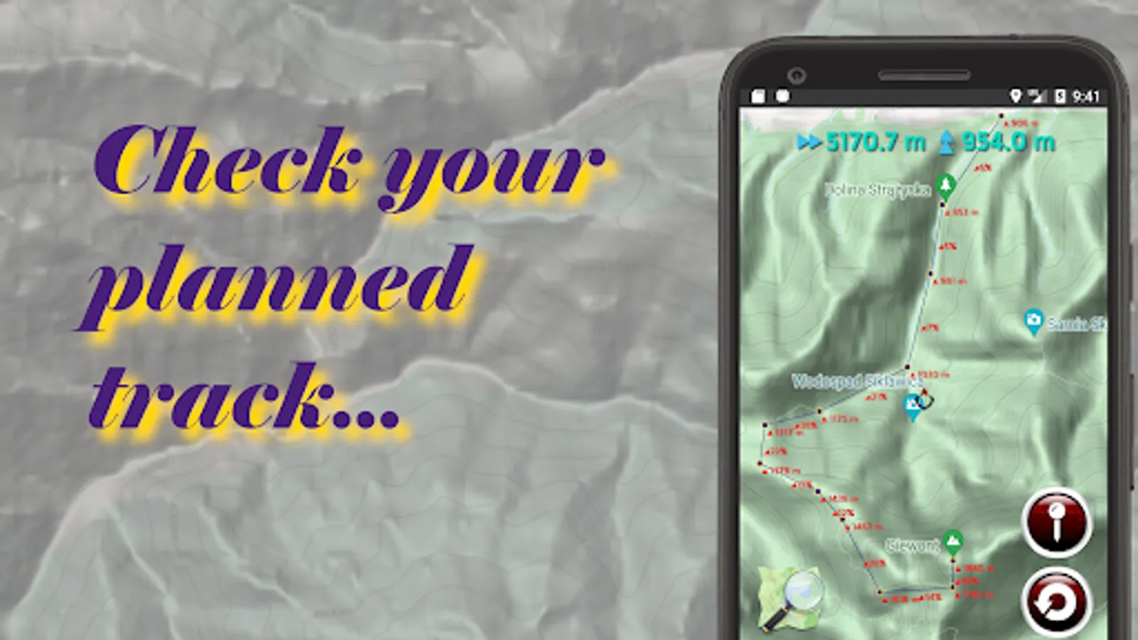 With this method you can mark on the map the area, the “distance path”, or the “elevation path”. Either tapping on the screen or setting precisely point with “pin” button (in the center of the screen). With the “elevation path” you can also check the depths of seas and oceans! Choose between Google Map and OSMDroid map. For Google Maps you can change layers too.