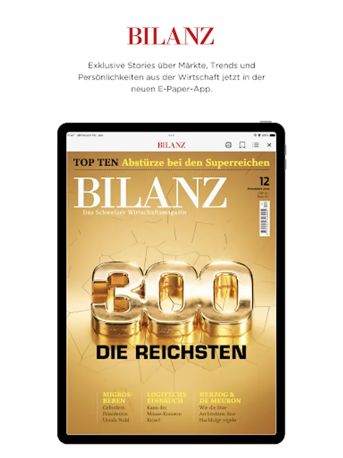 BILANZ covers all facets of economic activity: research from the corporate scene, analyzes from the economic sector, investment services and advice on spending money. A special focus of BILANZ are ratings and rankings in very different areas: hotels, airlines, private banks, funds, annual reports and the most powerful in the economy.