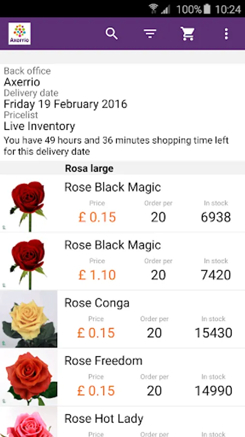 With Axerrio Flower Shop you can easily and quickly find and purchase floriculture products and see what orders there are. If you have an account on our web shop, you can use the same login information for this app.