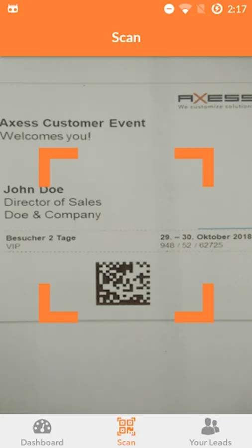 During the fair, the exhibitors' booth staff uses the Axess.Leads App to collect leads data by scanning the ticket barcode at the fair visitor's Print@home, mobile or Apple Wallet tickets.