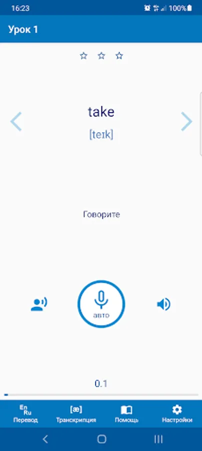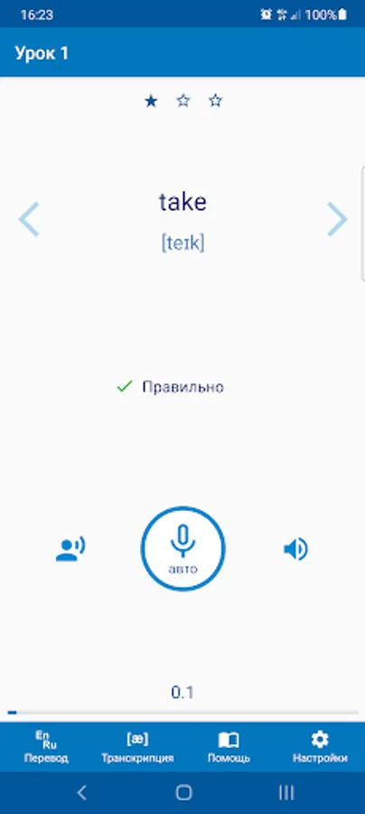 1. You repeat a word after a native speaker, see the word and its transcription.