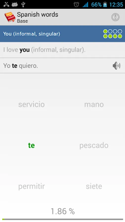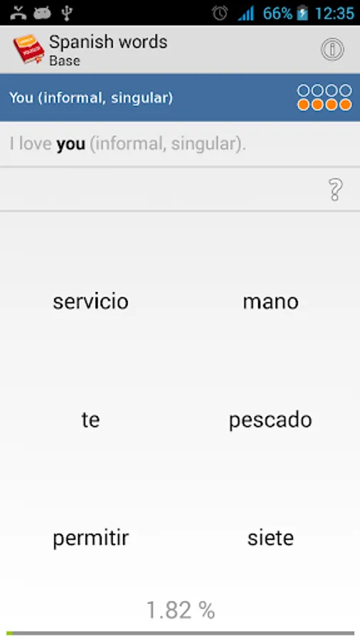 The app shows you a word and a sentence with this word in English. You have to answer how this word should be translated into Spanish.