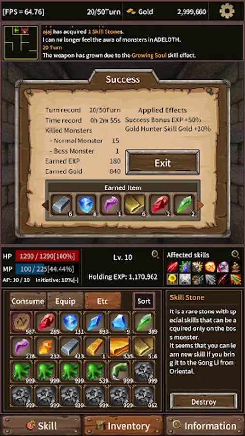 If you clear the dungeon after multiple battles and boss battle, you can get EXP and various items, which you can use to acquire more skills and powerful equipment.