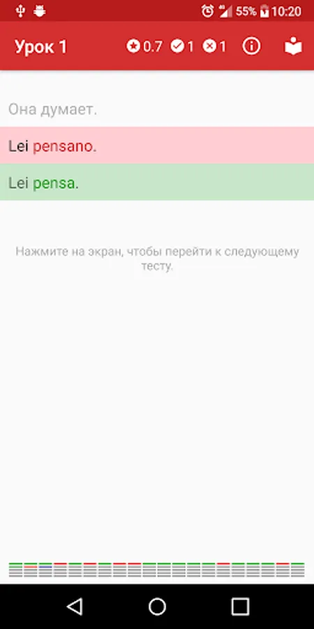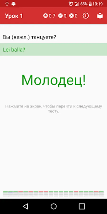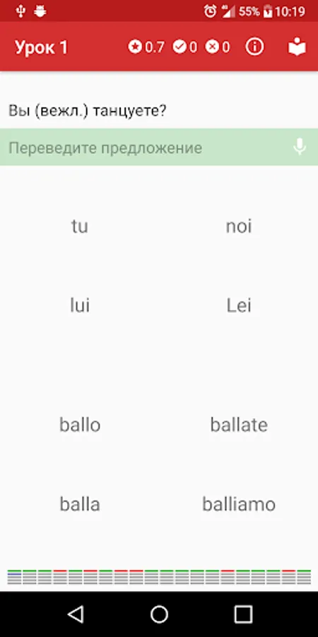The program offers you simple expressions in Russian in one of three forms (affirmative, negative, interrogative).