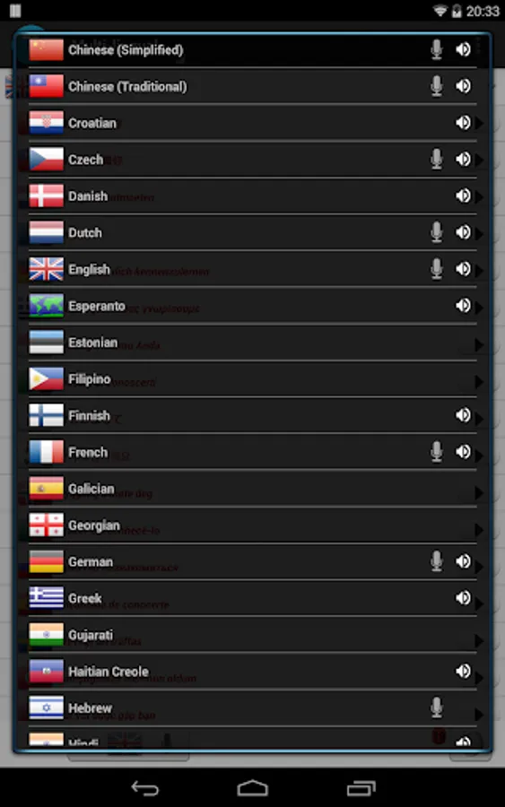 Afrikaans, Albanian, Arabic, Estonia, Bulgaria, Iceland, Poland, Bosnia, Danish, German, Russian, French, Philippines, Finland, Khmer, Gujarati, Korean, Netherlands, Catalonia, Czech, Croatia, Latin, Latvia, Romania, Marathi, Malayalam, Malay, Macedonia, Bangladesh, Myanmar, Nepal, Norway, Portugal, Japanese, Sweden, Serbia, Sinhala, Esperanto, Slovenia, Swahili, Telugu, Tamil, Thai, Turkey, Wales, Urdu, Ukraine, Spain, Hebrew, Greece, Hungary, Armenia, Italy, Hindi, Indonesian Sundanese, Indonesian, Indonesian Javanese, English, Vietnamese, Traditional Chinese, Simplified Chinese, Cantonese
