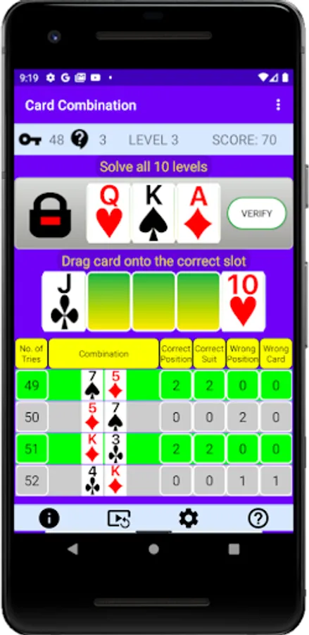 Solve all 10 card combinations within 52 guesses without using a hint.