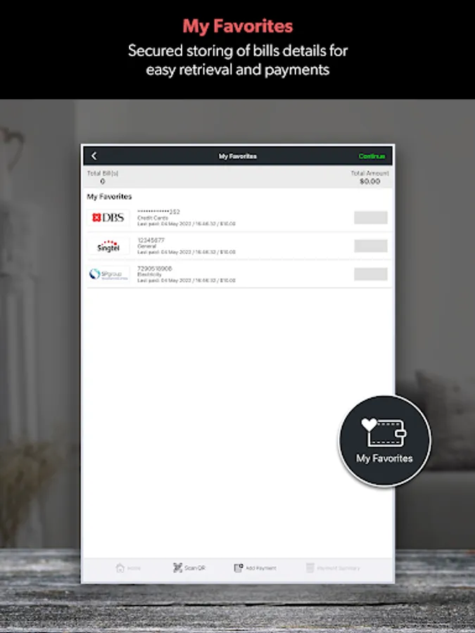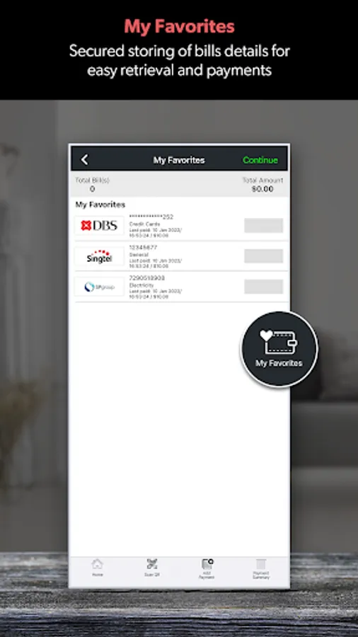 - Secured storing of your bill account details after each successful payment under "My Favorites" for easy retrieval and payment the next time (requires activation of passcode).