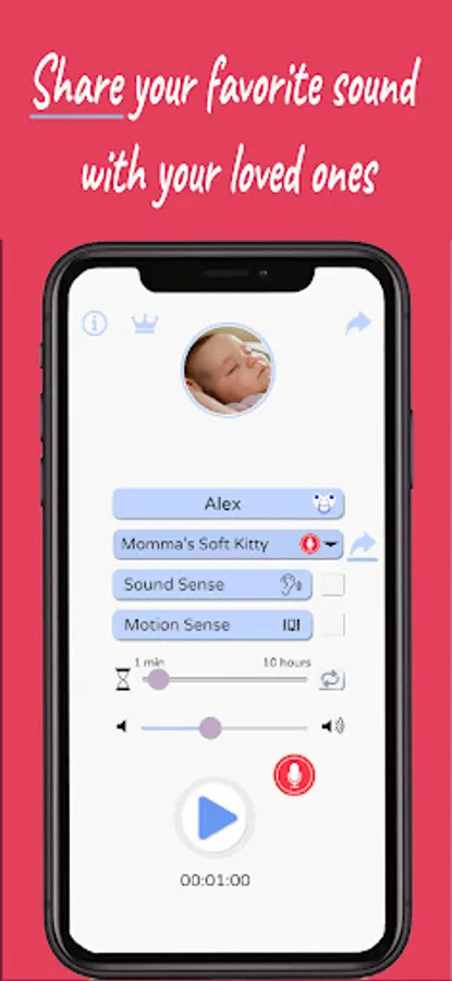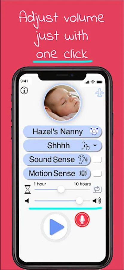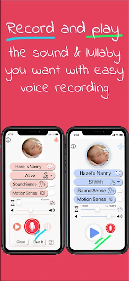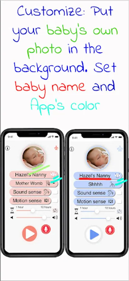 With the recording feature, you can record your child's favorite lullaby, song or story and play it as long as you want. You can set your phone to airplane mode and put it next to your child, or you can play it from a distance. Some of the many capabilities of this app are: