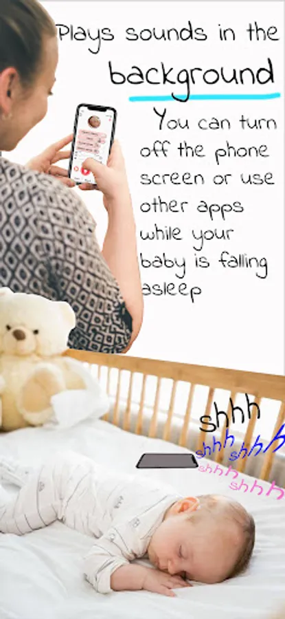 - It plays sounds in the background, you can turn off the phone screen or browse other applications on your phone while your baby is falling asleep.