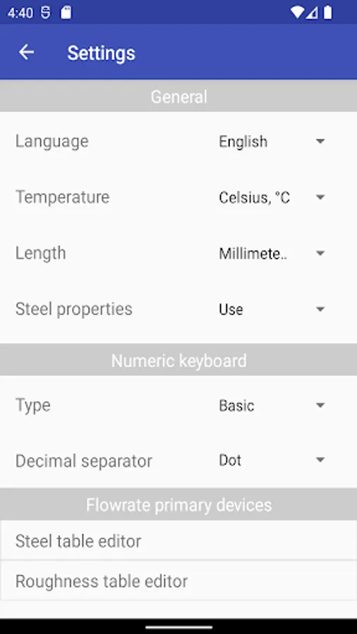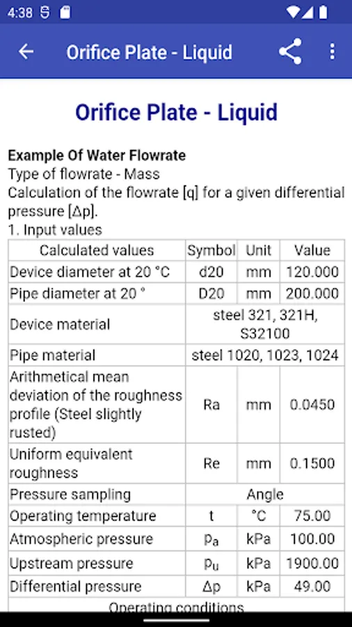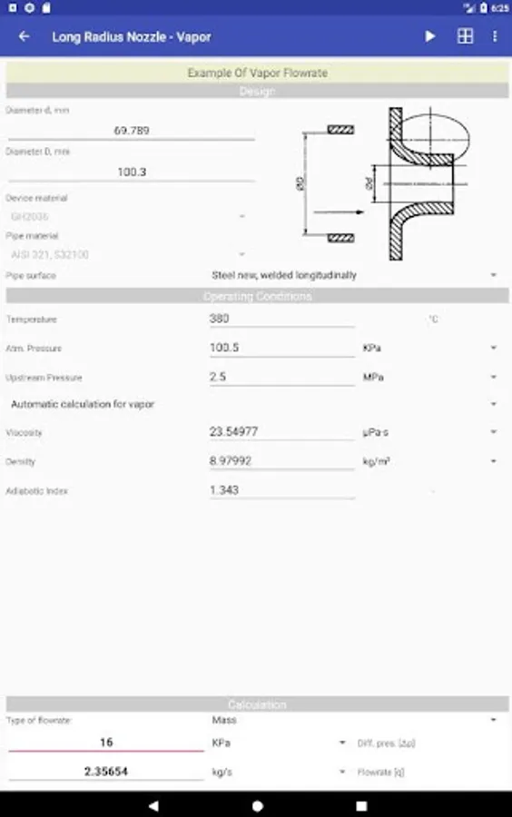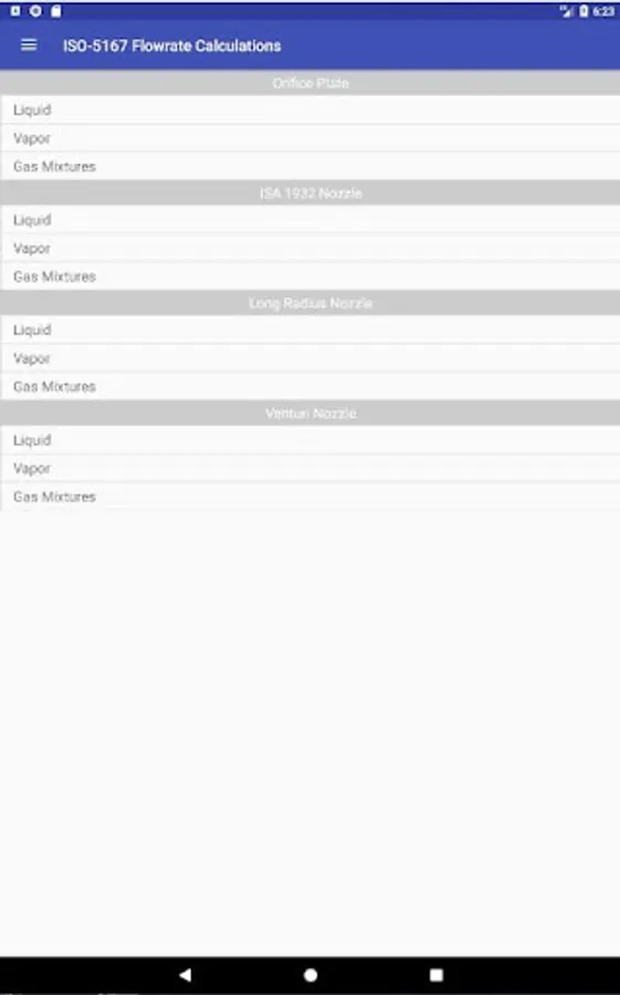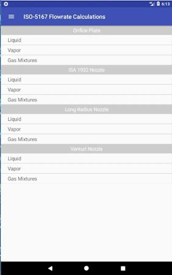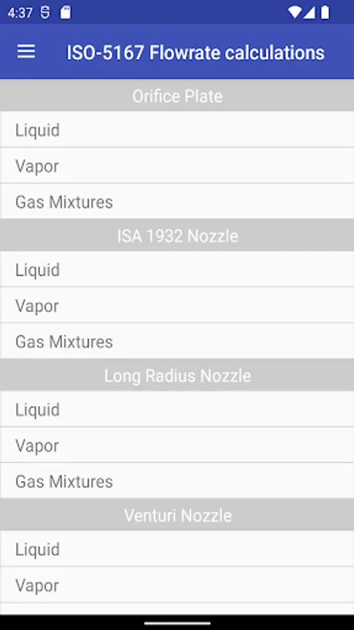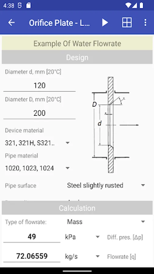 ISO-5167 Flow Rate Calculations is a mobile application for Android, intended for both experts in the field of automation and metrology, and students of technical specialties. It implements methods for calculating the flow rate of liquids, vapors and gases by measuring the differential pressure on primary devices as the substances pass through them.