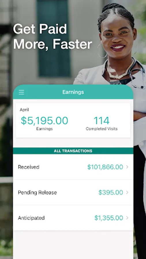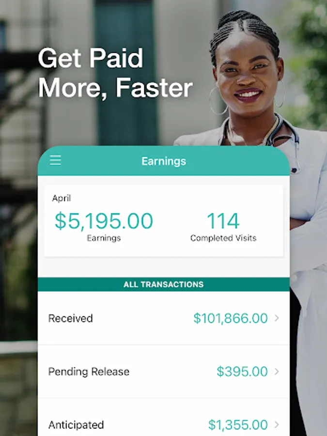 Get paid every time you complete a visit. See all your pending, anticipated and received earnings in the app.