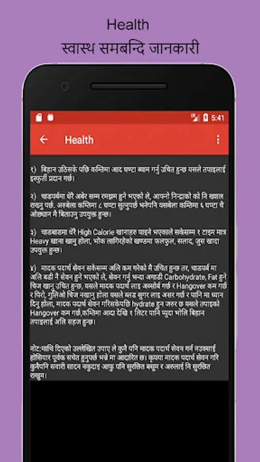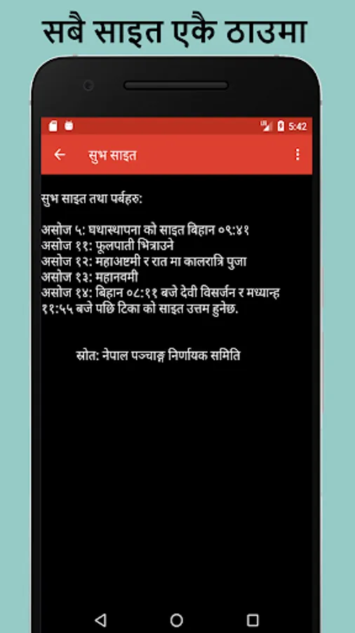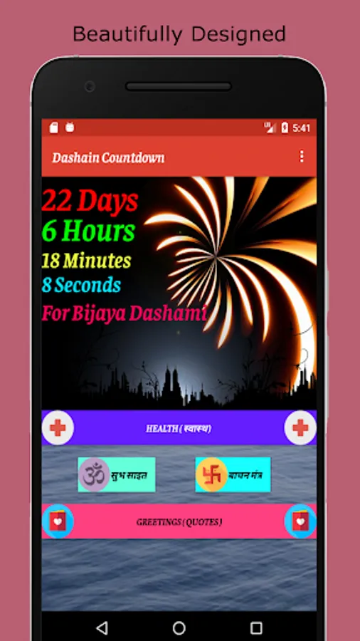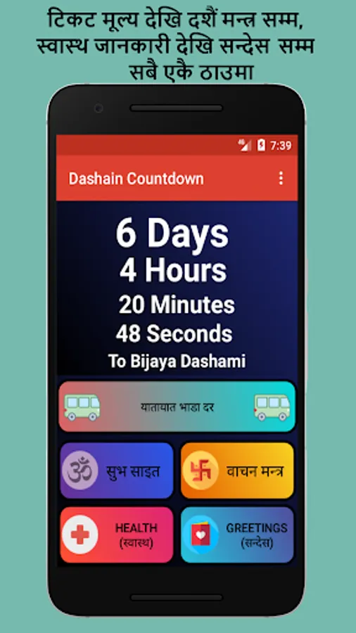 This is not only a countdown app but it has many more features, unlike others. It includes a well-wishing message " Greeting " not only that, but This app provides you the Health Care Tips along with Dashain Mantra and Subha Saait. Whaaaat! Don't get shocked. Yes, this app does all of the mentioned work and the plus point is this app is not even more than 1 Mb. Yeah, another shocker- just 1 Mb and multiple works. Overall you will feel pleasure using this app. It's really handy and beautifully designed. With the help of this app, you don't even need to tune news television to know about the exact Saait, no physical calendar to required to see the date, and no need to visit the Bahun for mantra as well as other parba.