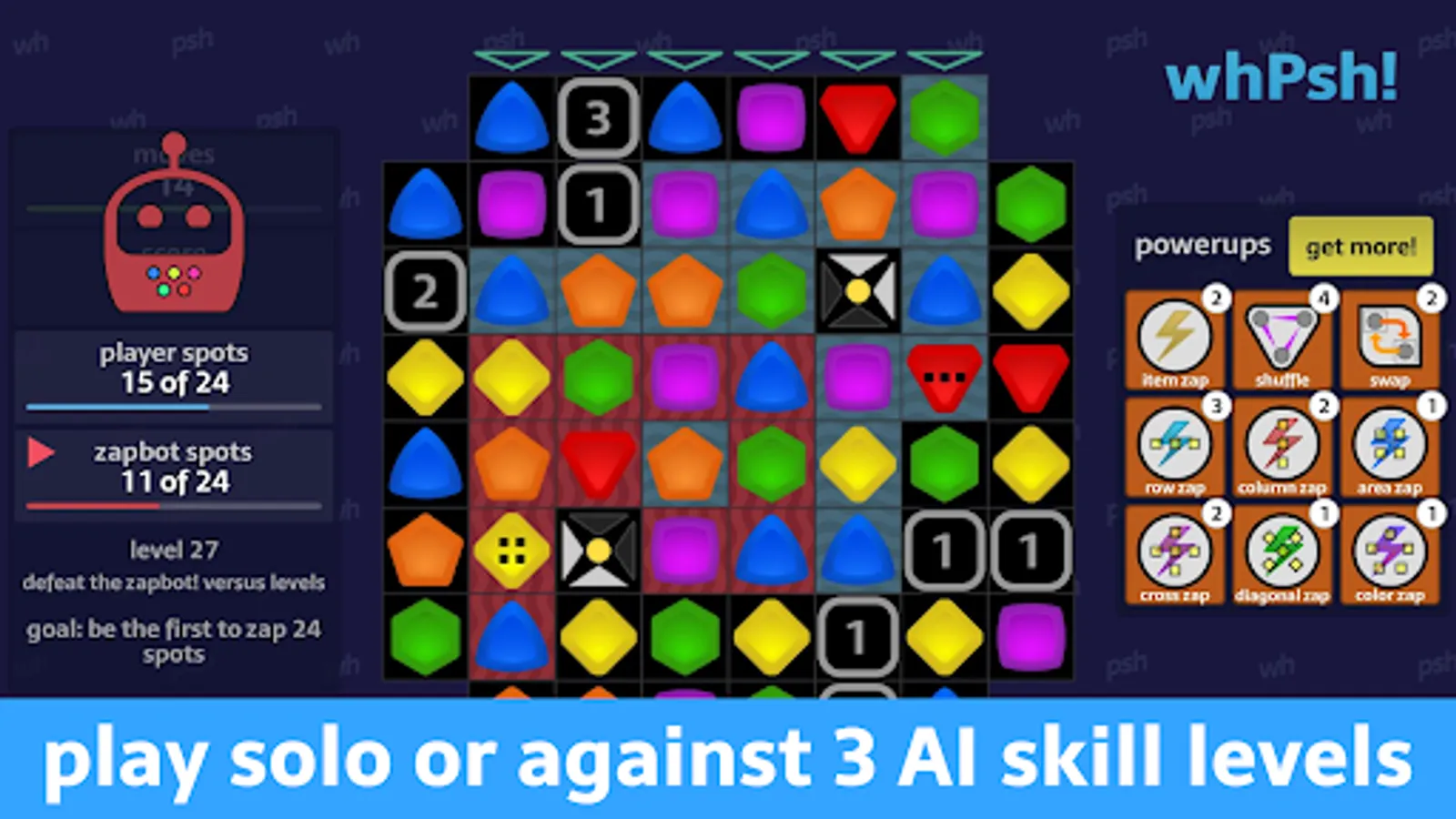 -- Play solo or try to defeat three AI skill levels in head-to-head competition.