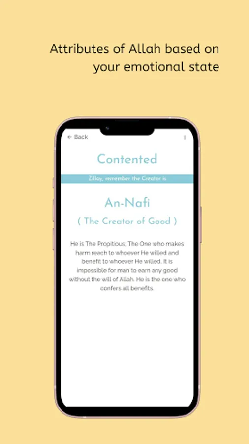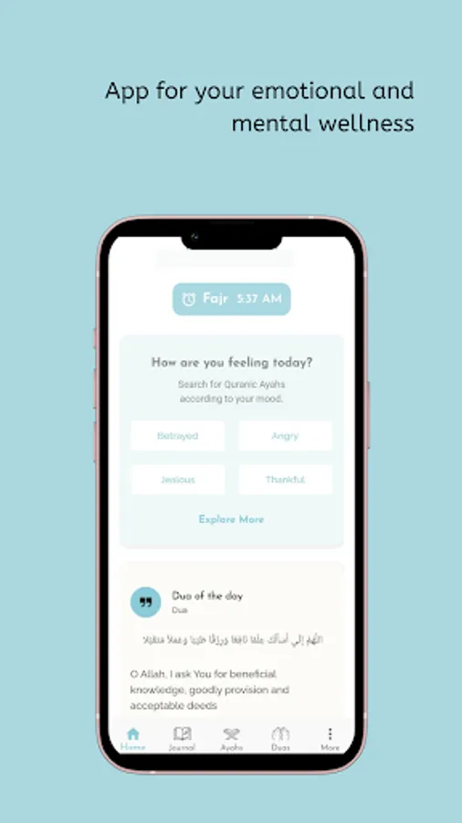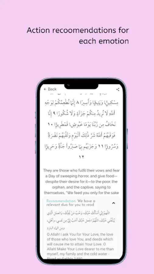- Action recommendations for each emotion in the form of Dua from Quran and Hadith, Azkar, names of Allah and relevant hadith to read