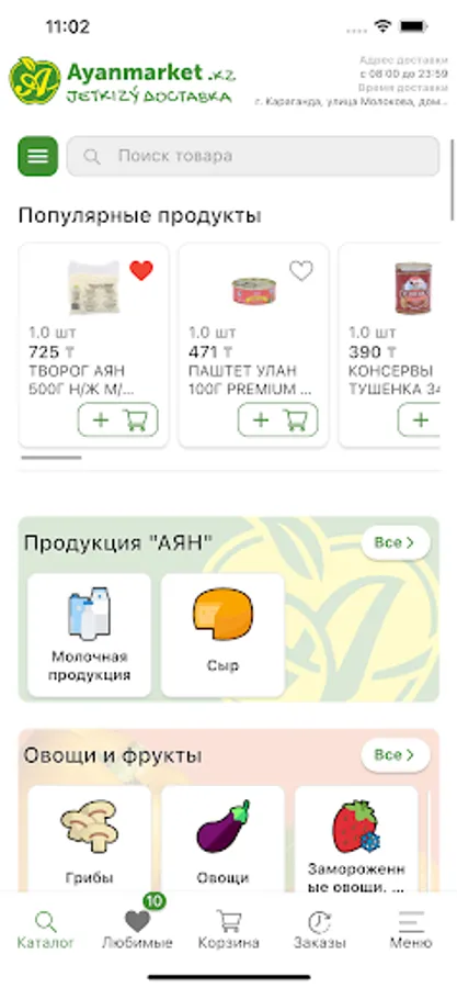 This is a service for the delivery of food products from the network of supermarkets "AYAN" in the cities of Nur-Sultan, Karaganda and Temirtau. Here you can order free delivery of vegetables and fruits, dairy products, cheese and sausages, as well as the whole range of supermarkets AYAN to apartments.