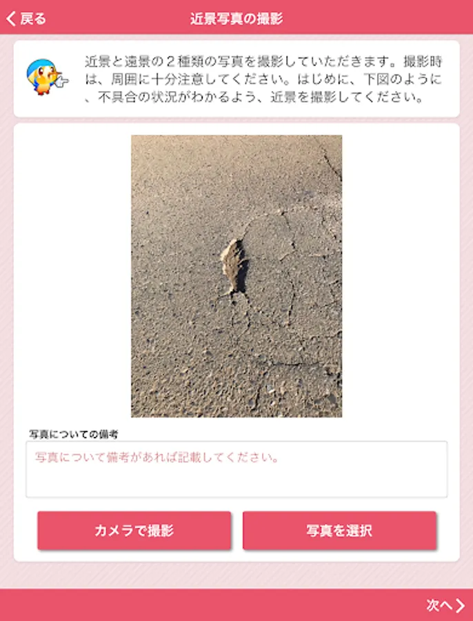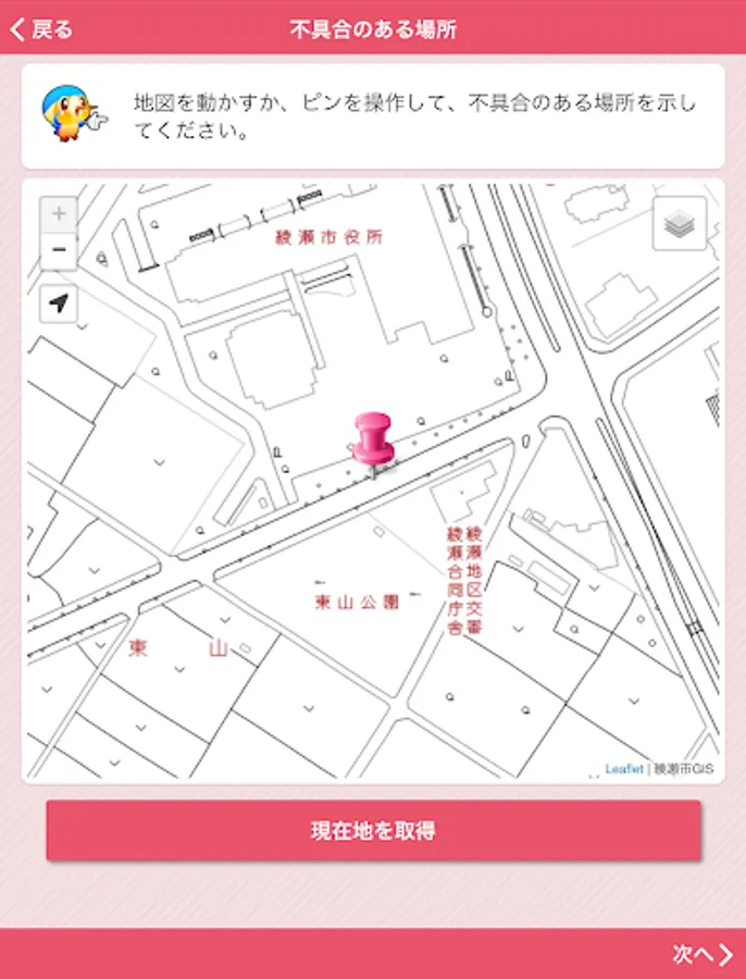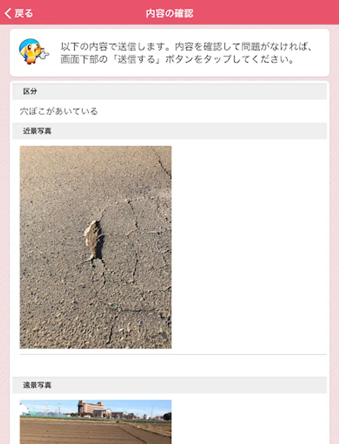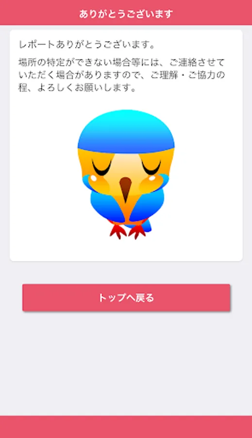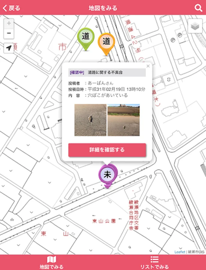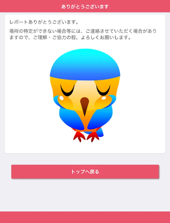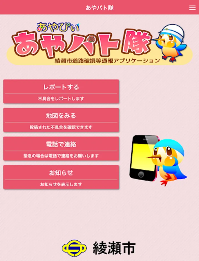 It is an application that can report the broken part etc. of the road managed by Aya City, both photos and position information. In order to report, it is necessary to perform user registration when using this application for the first time.