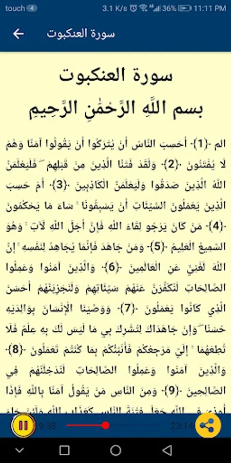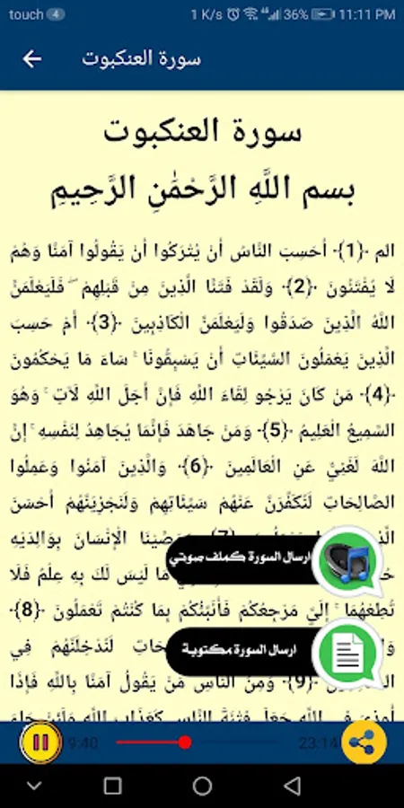 By pressing the (Next Surah) and (Previous Surah) button, you can listen to the previous surahs of the surah you are listening to, as well as the following surahs. The program also shows you the duration of each surah so that you are aware of this.